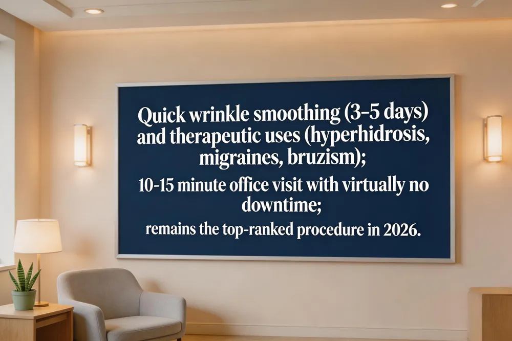 Anti‑wrinkle injections have become the most sought‑after aesthetic treatment worldwide, driven by their proven efficacy, safety profile, and convenience. Botox, the flagship product, dominates the market because it delivers rapid smoothing of dynamic lines—such as frown lines, crow’s feet, and forehead creases—within 3‑5 days, and most patients resume normal activities immediately. Beyond wrinkle reduction, clinicians now employ Botox for a growing array of therapeutic applications, including treatment of jaw‑clenching (bruxism), excessive facial sweating (hyperhidrosis), migraine prophylaxis, and even early‑stage facial contouring. These expanded uses reinforce its appeal to both aesthetic‑focused and medically‑oriented patients. The procedure’s minimally invasive nature, coupled with a typical 10‑15 minute office visit and virtually no downtime, makes it an ideal lunchtime treatment. Consequently, Botox remains the top‑ranked procedure in 2026, consistently ranking highest in patient surveys and clinic schedules across luxury medical spas and mainstream practices alike.