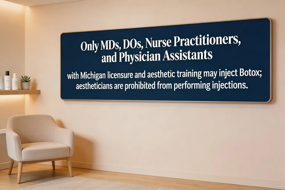 Can aestheticians perform Botox injections in Michigan? No. In Michigan, aestheticians are not permitted to inject Botox or other neuromodulators. Only MDs, DOs, NPs, and PAs who meet the state’s licensing and training standards may administer these treatments, ensuring a high level of safety and professional accountability.