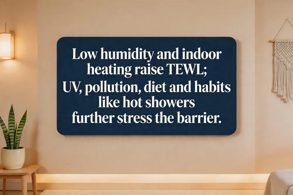 Across the United States, climate swings dramatically—from the dry, low‑humidity winters of Michigan to the hot, humid summers of the South. Low ambient humidity and indoor heating raise transepidermal water loss (TEWL), leaving skin tight and prone to irritation, while high UV index and pollution accelerate lipid oxidation and disrupt the acid mantle. Humidity in coastal regions can be protective, but sudden changes still stress the barrier.