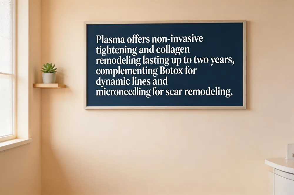 Cold plasma skin tightening and Botox address different signs of aging. Botox relaxes facial muscles to smooth dynamic wrinkles with rapid results lasting 3‑4 months, whereas plasma creates micro‑injuries that stimulate collagen and elastin, improving texture, firmness, and sagging over weeks with effects that can persist up to two years. Therefore, plasma is preferable when static laxity is the primary concern, while Botox excels for dynamic lines.