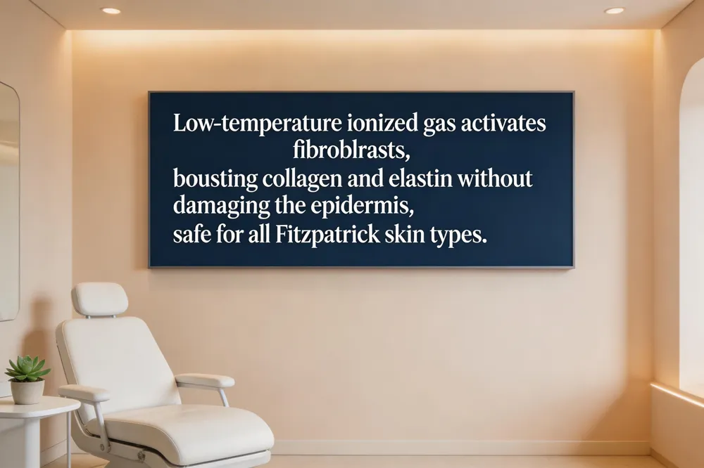 Cold plasma devices generate a low‑temperature ionized gas that creates microscopic thermal columns on the skin surface, Cold plasma activates fibroblasts to boost collagen and elastin production without damaging the epidermis. Professional units deliver high‑voltage pulses (13,000‑15,000 V) in a controlled, safe manner and often include ozone‑filter systems that keep emissions below 0.05 ppm, protecting both patient and practitioner. The technology is non‑thermal, operating at 35‑40 °C, which distinguishes it from hot plasma and ablative lasers that rely on heat and can cause burns or pigment changes. Because it does not depend on chromophores, cold plasma is safe for all Fitzpatrick skin types and offers minimal downtime. Clinical evidence confirms that cold plasma reduces fine lines, wrinkles, hyperpigmentation, and inflammation while boosting skin hydration and enhancing topical product absorption, making it a versatile, FDA‑cleared option for facial rejuvenation.