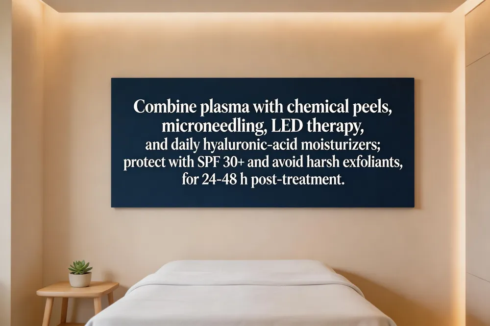 Cold‑plasma facials work best when paired with complementary professional treatments. Chemical peels, microneedling, and non‑ablative laser tightening create micro‑injuries that further stimulate fibroblasts, while dermaplaning and microdermabrasion refine texture and enhance plasma penetration. At home, patients can boost results with daily moisturizers containing hyaluronic acid and antioxidant‑rich serums, gentle retinoids or low‑strength glycolic/lactic peels (2‑5 %), and short‑duration red or near‑infrared LED sessions (10‑15 min, 2–3 × week). After each plasma session, apply a soothing barrier cream, avoid harsh exfoliants for 24‑48 h, and protect the skin with SPF 30+ sunscreen.