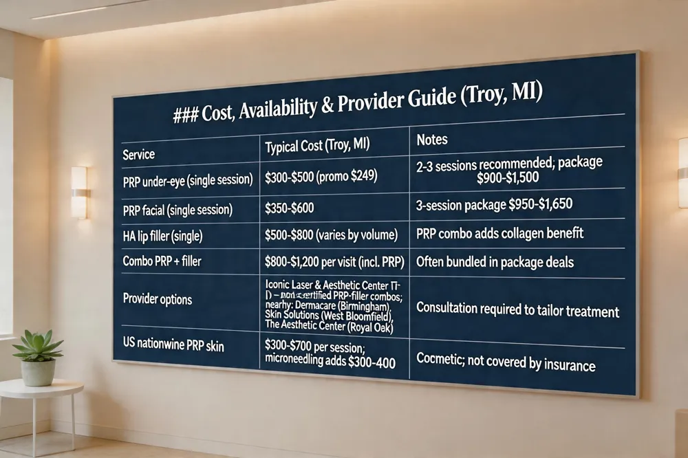 | Provider options | Iconic Laser & Aesthetic Center (Troy) – board‑certified PRP‑filler combos; nearby: Dermacare (Birmingham), Skin Solutions (West Bloomfield), The Aesthetic Center (Royal Oak) | Consultation required to tailor treatment |