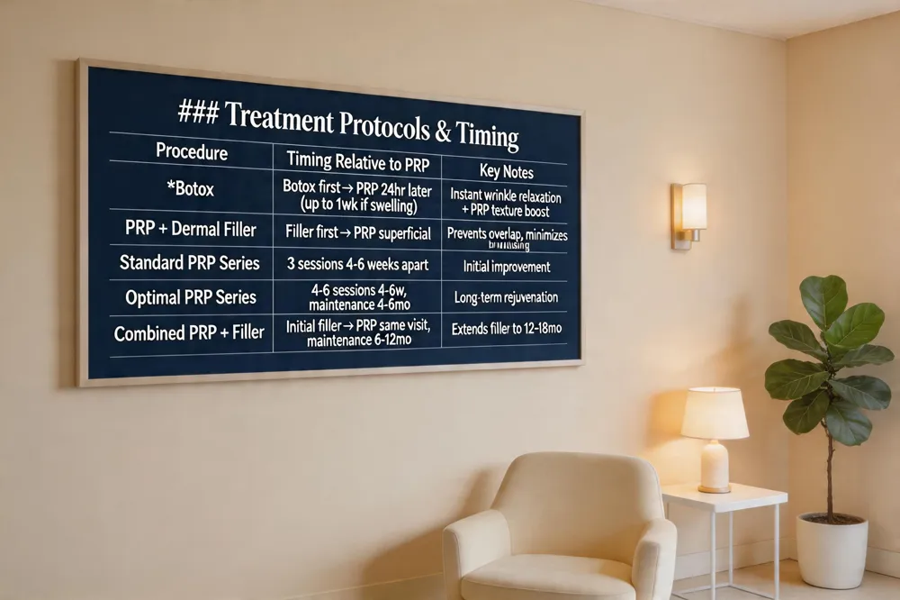 | PRP + Dermal Filler | Filler placed first (deep plane) → PRP injected or microneedled superficially | Prevents overlap, minimizes bruising |