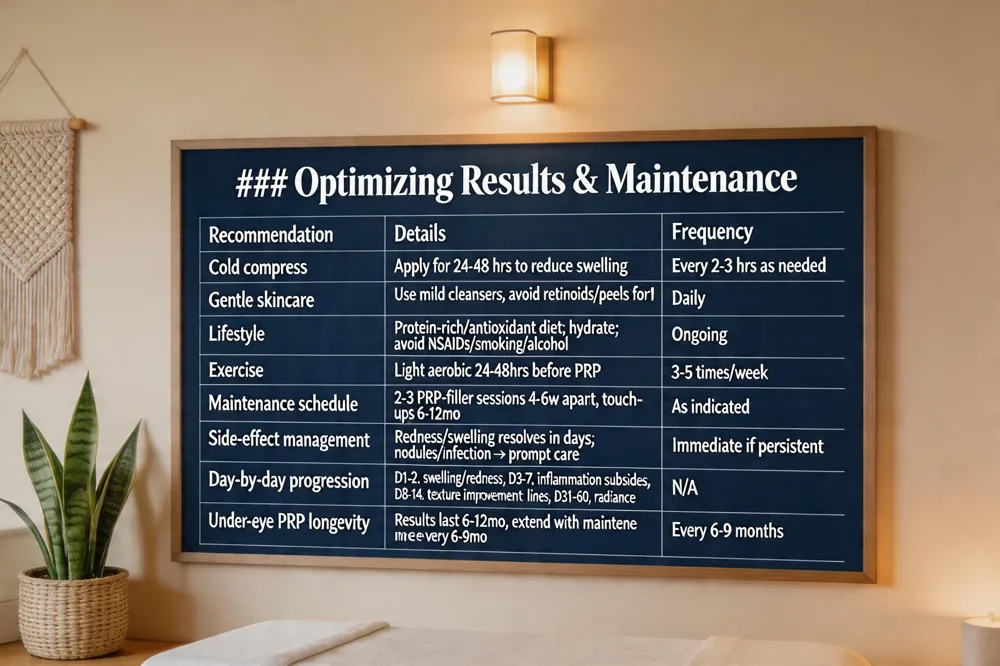 Post‑procedure care is essential for maximizing the benefits of PRP‑plus‑filler treatments. Patients should apply cold compresses for the first 24‑48 hours, keep the area clean, avoid heavy lifting, and use gentle skin‑care products to reduce bruising and swelling. Lifestyle factors that boost PRP efficacy include a protein‑rich, antioxidant‑dense diet, ample hydration, and avoidance of NSAIDs, smoking, and excessive alcohol, all of which support platelet function and collagen synthesis. Regular aerobic exercise before treatment improves red‑blood‑cell health, further enhancing the regenerative response. Maintenance schedules typically involve 2‑3 combined sessions spaced 4‑6 weeks apart, with touch‑up filler or PRP sessions every 6‑12 months to sustain volume and skin quality.