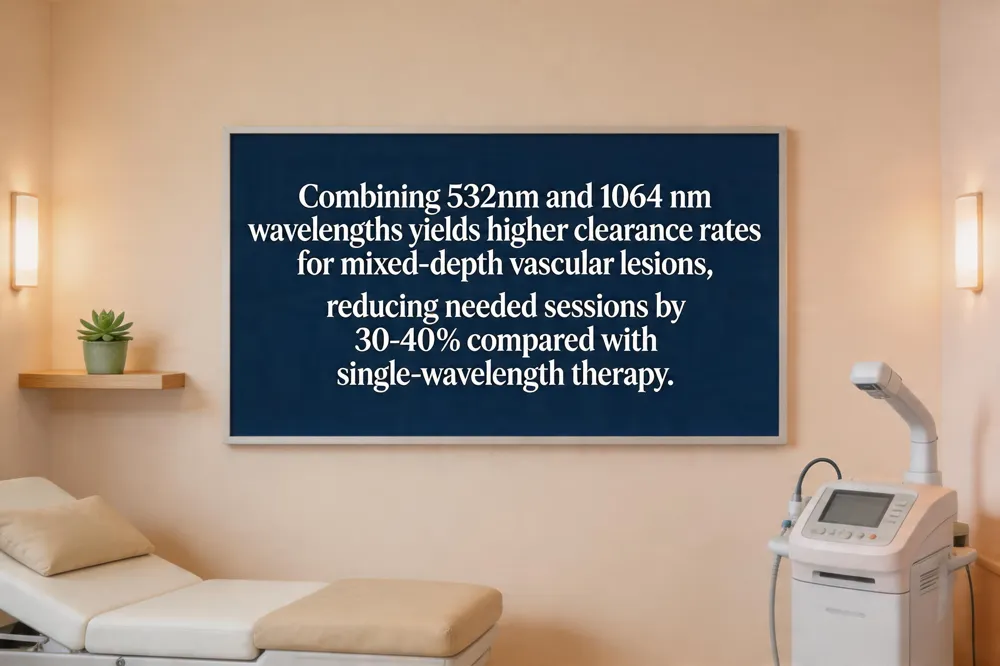 Dual‑wavelength platforms (e.g., 532 nm KTP + 1064 nm Nd:YAG) treat telangiectasias, rosacea, spider veins, and port‑wine stains by selective photothermolysis of oxyhemoglobin. Short‑pulse 532 nm absorbs superficially (papillary dermis) for fine vessels, while 1064 nm penetrates several millimeters to coagulate deeper feeder vessels. Clinical studies (PMID 32371774) show higher clearance rates for mixed‑depth lesions versus single‑wavelength therapy, and a 30‑40 % reduction in required sessions (see multi‑mode digital sources). Typical protocols use low‑fluence 1064 nm followed by 532 nm for surface cleanup, spaced 4‑6 weeks apart; 3‑5 sessions are common for optimal results.