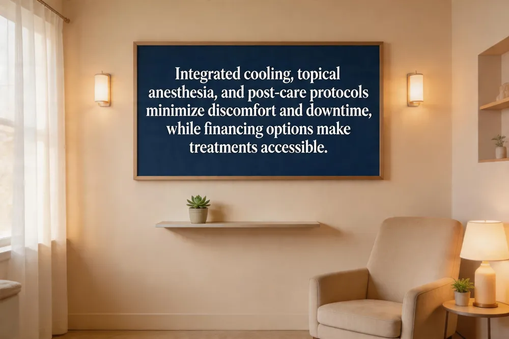 Safety is high when providers use built‑in cooling (cryogen spray or contact cooling) and test spots; most patients feel a brief pinching or rubber‑band sensation and experience only mild erythema, swelling, or transient darkening that resolves within 48 hours. Topical numbing creams and post‑procedure sunscreen (SPF 30+) further enhance comfort and prevent post‑inflammatory hyperpigmentation, especially in Fitzpatrick III‑VI skin.