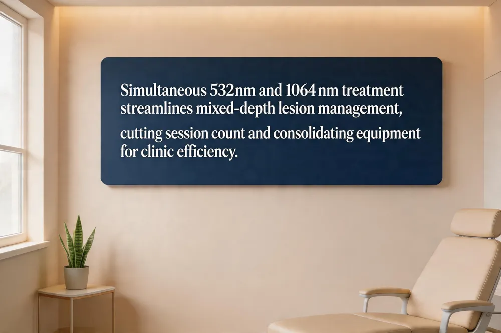 Dual‑wavelength laser platforms enable simultaneous treatment of facial redness and hyperpigmentation by delivering a short‑pulse 532 nm (or 585‑595 nm) energy for superficial hemoglobin and melanin, followed by a longer‑pulse 1064 nm Nd:YAG pulse for deeper vascular and pigmented lesions. Clinicians can fine‑tune fluence and pulse duration for each wavelength, allowing low‑fluence 1064 nm to coagulate deep vessels and higher‑fluence 532 nm to clean up surface telangiectasias without excess thermal spread. Clinical studies (e.g., PMID 32371774) report higher clearance rates for mixed‑depth lesions and a 30‑40 % reduction in required sessions versus sequential single‑wavelength therapy, translating into a strong return on investment for clinics by consolidating two devices into one platform and increasing patient throughput.