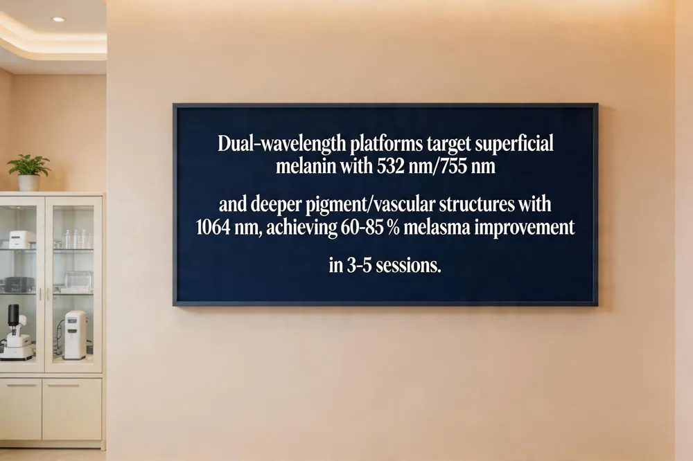 Melanin absorbs light most efficiently at 532 nm (green) and 755 nm (alexandrite), while deeper dermal pigment and vascular structures respond best to 1064 nm (Nd:YAG). Dual‑wavelength platforms combine a short‑pulse 532 nm or 755 nm channel for superficial sun spots, lentigines, and melasma with a longer‑pulse 1064 nm channel that penetrates several millimetres to coagulate deeper vessels and darker pigment. Clinical trials (e.g., PMID 32371774) report 70‑80 % clearance of telangiectasias and 60‑85 % improvement in melasma after 3‑5 sessions spaced 4‑6 weeks apart, with a 30‑40 % reduction in total visits versus single‑wavelength protocols.