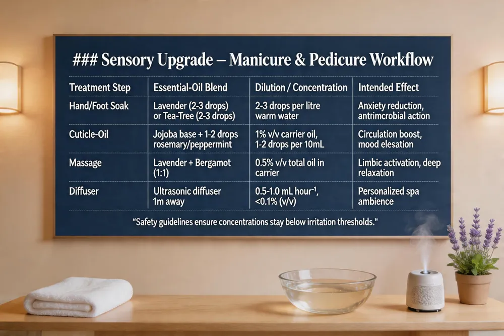 Massage aromatherapy techniques – During the hand‑massage phase, clinicians use a customized blend (lavender + bergamot) massaged into the skin and cuticles, activating the limbic system and enhancing relaxation. Low‑frequency ambient music (40‑60 Hz) can be paired to amplify parasympathetic response.