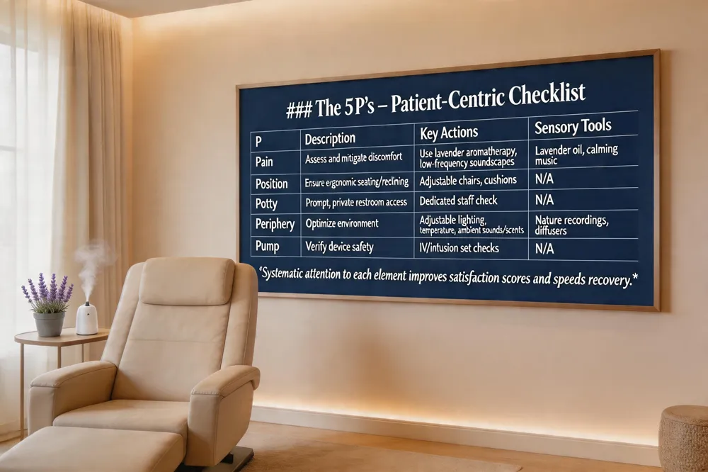 The 5 P’s of patient satisfaction in a clinic setting are Pain, Position, Potty, Periphery, and Pump. Clinicians first assess pain and use evidence‑based, non‑pharmacologic tools—such as lavender aromatherapy or low‑frequency soundscapes—to keep discomfort low. Next, they verify position, ensuring the patient is comfortably seated or reclined and can be adjusted with ergonomic supports. The potty component addresses restroom needs promptly and privately, reducing anxiety and interruptions. Periphery covers the immediate environment: adjustable lighting, temperature control, and calming ambient sounds or scents create a soothing atmosphere that has been shown to lower cortisol and heart rate, thereby enhancing overall comfort. Finally, staff perform pump and device safety checks, confirming that IVs, infusion sets, and any therapeutic devices are functioning correctly and safely. By systematically attending to each of these five elements, clinics create a holistic, patient‑centered experience that improves satisfaction scores, reduces procedural stress, and supports faster recovery.