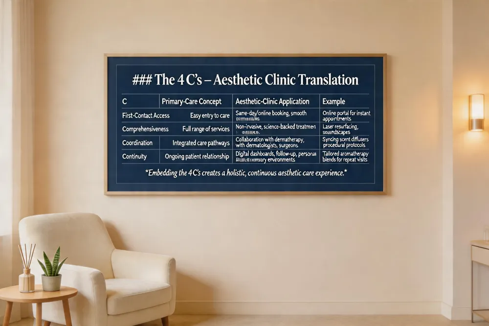 The four Cs of primary care are first‑contact access, comprehensiveness, coordination, and continuity of care. In an aesthetic clinic, first‑contact access means offering easy, same‑day or online booking and a welcoming intake process for new patients. Comprehensiveness is reflected in a full suite of non‑invasive, science‑backed services—laser skin resurfacing, micro‑needling, injectable fillers, and wellness‑focused treatments such as aromatherapy and therapeutic soundscapes—that address a patient’s whole aesthetic health. Coordination involves seamless referrals and collaboration with dermatologists, plastic surgeons, and allied specialists to ensure safe, integrated treatment plans; for example, a clinic may sync programmable scent diffusers and low‑frequency ambient music with procedural protocols to reduce anxiety and pain, as documented in multiple clinical trials. Continuity is achieved by building long‑term relationships, tracking outcomes over time with digital dashboards, and providing ongoing maintenance, follow‑up care, and personalized sensory environments that boost satisfaction scores and promote faster recovery.