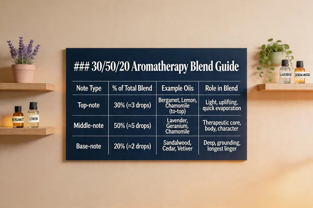 The 30/50/20 rule is a simple guideline for creating balanced essential‑oil blends by dividing the formula into three scent‑note categories. It calls for roughly 30 % top‑note oils, which are light, uplifting aromas that evaporate quickly; 50 % middle‑note oils, the “heart” of the blend that provide body and character; and 20 % base‑note oils, the deep, grounding scents that linger longest. For a 10‑drop blend, use 3 drops of top notes, 5 drops of middle notes, and 2 drops of base notes.