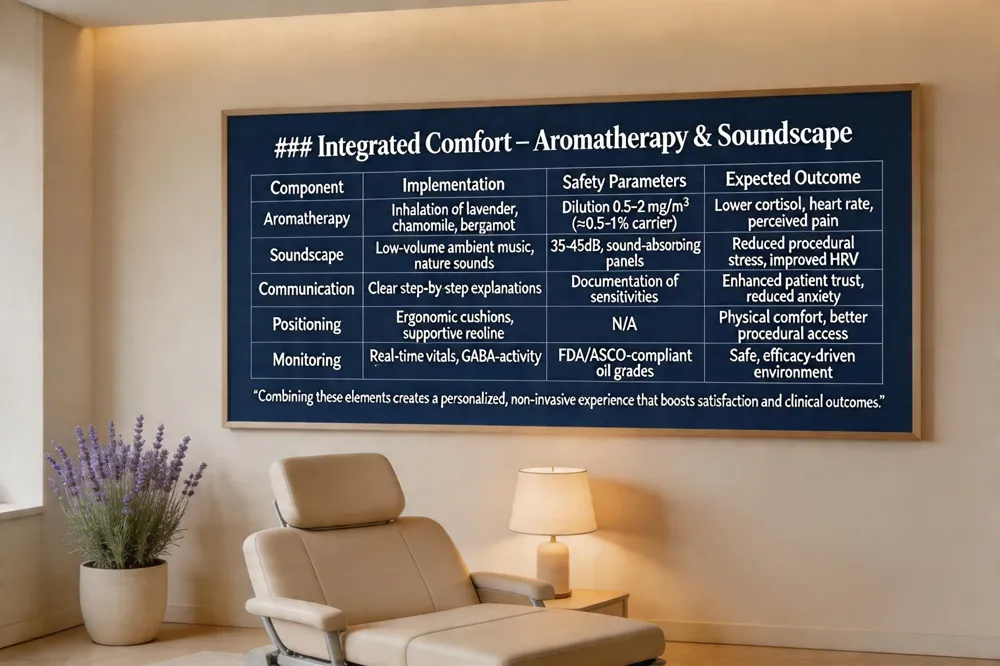 Clinicians can ensure patient comfort by creating a private, dignified environment and explaining each step in clear, reassuring language. Gentle positioning, supportive cushions, and the use of topical anesthetics or mild sedation reduce physical discomfort, while continuous communication lets the provider address pain or concerns promptly. Evidence‑based symptom management shows that inhalation of therapeutic‑grade essential oils—particularly lavender, chamomile, and bergamot—lowers cortisol, heart rate, and perceived pain, making them valuable adjuncts for pre‑procedure anxiety and intra‑procedure discomfort. Soundscape design further enhances this effect: low‑volume ambient music, nature sounds (rain, ocean waves), and sound‑absorbing panels mask equipment hum and lower heart‑rate variability, contributing to a calmer atmosphere. Essential oils that boost GABA activity, such as lavender, basil, and chamomile, directly promote relaxation by modulating GABA_A receptors. Safety protocols require dilution of oils to 0.5–2 mg/m³ (≈0.5–1 % carrier oil), use of hypoallergenic, pharmaceutical‑grade preparations, and documentation of patient sensitivities to meet FDA and ASCO guidelines. By integrating empathetic communication, precise positioning, aromatherapy, and curated soundscapes within a regulated framework, aesthetic clinics deliver a personalized, non‑invasive experience that improves satisfaction and clinical outcomes.