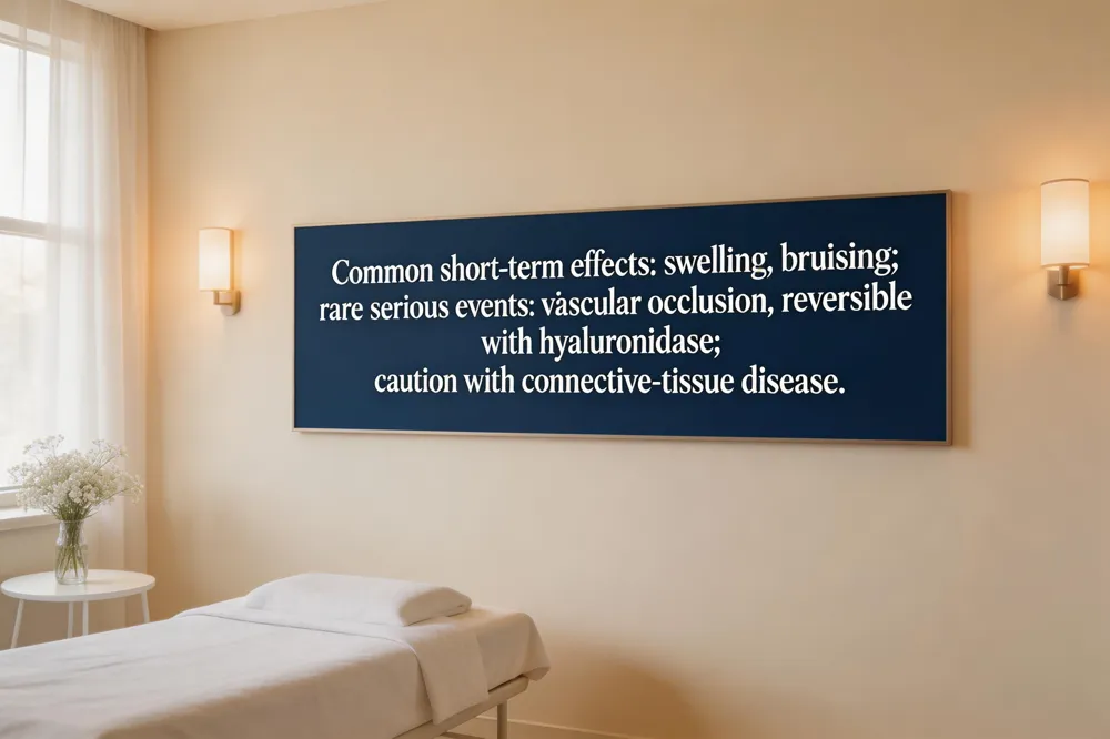 Common short‑term reactions to hyaluronic‑acid (HA) lip fillers include swelling, bruising, tenderness, and a temporary feeling of fullness that usually resolve within 24‑48 hours, with most patients feeling back to normal within a week. Occasionally, patients may notice small nodules, mild asymmetry, or brief discoloration from superficial bruising. Rare serious complications, though exceedingly uncommon, involve vascular occlusion that can lead to tissue necrosis, infection, or a severe allergic response; immediate treatment with hyaluronidase and medical intervention is required. Because HA fillers are reversible, clinicians can dissolve the product if adverse events occur. Patients with systemic connective‑tissue diseases such as scleroderma can be considered for HA lip augmentation when the disease is stable and activity is low. The low‑cross‑linked HA gels (e.g., Restylane Silk or Juvederm Ultra XC) have a favorable safety profile and are unlikely to trigger disease flares, but treatment should be coordinated with the patient’s rheumatologist and performed by a board‑certified injector to ensure vigilant monitoring and optimal outcomes.