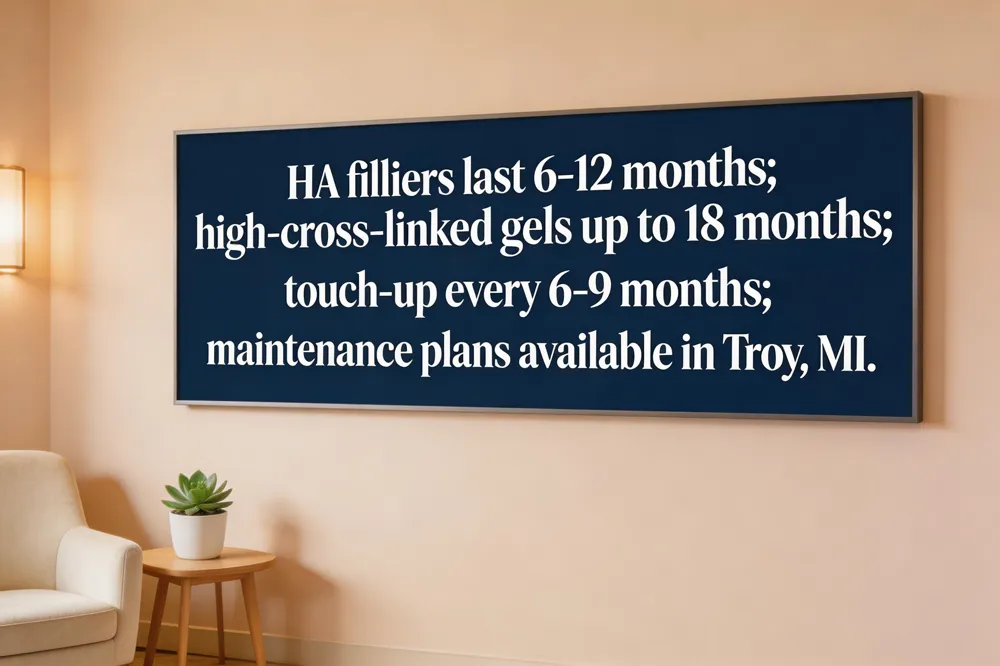 Most hyaluronic‑acid lip fillers last six to twelve months, with newer, higher‑cross‑linked gels such as Restylane Kysse or Juvéderm Ultra Plus persisting up to 18 months in slower metabolisms. Longevity depends on filler brand, cross‑link density, volume injected, injection technique, and patient factors like age, smoking, sun exposure, and metabolic rate. Typically a touch‑up at six to nine months maintains the desired shape. If you’re searching for “lip filler near me” in Troy, Michigan, our board‑certified clinic offers FDA‑approved HA products (Juvederm Ultra XC, Restylane‑L, Restylane Refyne) performed by experienced injectors using cannula or needle methods for natural, lasting results. Schedule a complimentary consultation to create a personalized maintenance plan.