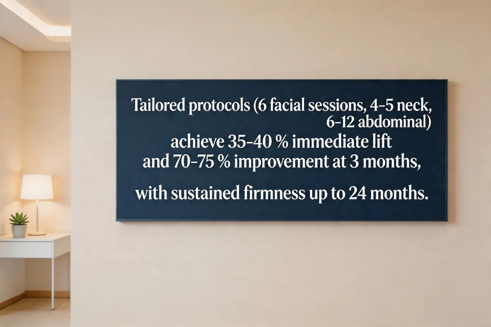 Results timeline per area – Clinical data show skin‑tightening gains of 35‑40 % at treatment end, rising to 70‑75 % after three months; wrinkle reduction improves from 40‑45 % to 90‑95 % in the same period. Face and neck typically exhibit visible lift within 2‑4 weeks, with maximal collagen maturation at 3‑6 months. Tummy skin shows a subtle lift after a single session, with continued firmness for up to 12‑24 months when a full 6‑12‑session course is completed.