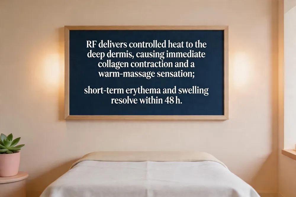Radiofrequency (RF) skin tightening works by delivering controlled electromagnetic energy that heats the deep dermis. Monopolar RF uses a single active electrode and a grounded plate, producing a uniform, three‑dimensional heat field that penetrates 3‑5 mm and causes immediate collagen fiber contraction. Bipolar RF, in contrast, employs two adjacent electrodes that confine the heat to a shallower, more focused zone, which can be useful for finer texture work but delivers less deep tightening. The rapid temperature rise (50‑75 °C) denatures collagen, resulting in an instant lift and a warm‑massage sensation during the session. Within hours to days, patients may notice mild erythema, swelling, tingling or a transient crusting—these short‑term side‑effects typically resolve within 24‑48 hours and are considered normal. Rarely, superficial burns or hyperpigmentation occur, especially if settings are too aggressive. Overall, RF does not cause sagging; instead, it stimulates neocollagenesis and elastin remodeling that progressively firm the skin over weeks to months. Before‑and‑after observations show tighter, smoother skin with reduced fine lines and a lifted contour, while post‑procedure care (sunscreen, hydration, antioxidants) helps sustain the results. Proper patient selection and an experienced, FDA‑cleared provider minimize risks and ensure optimal outcomes.