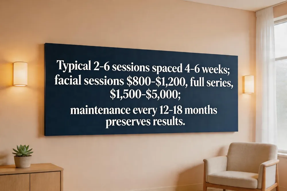 Single‑area facial or neck treatments start at $300–$800. Larger zones such as abdomen, thighs, or full‑body contouring cost $1,200–$2,500 per visit. A full series of 3–5 sessions typically totals $1,500–$5,000. Financing options and package discounts are common in the Troy market.