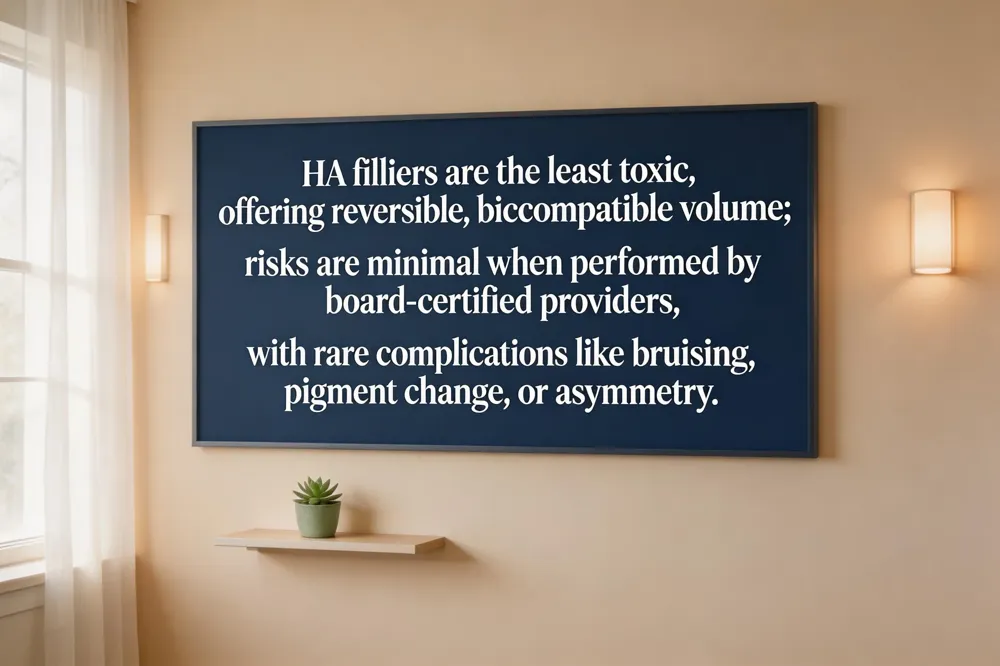 What is the least toxic filler? Hyaluronic‑acid (HA) fillers are the safest. HA is a natural skin component, biocompatible and reversible with hyaluronidase, lowering allergy risk. Other biodegradable fillers are safe, but HA consistently ranks as the least toxic choice.