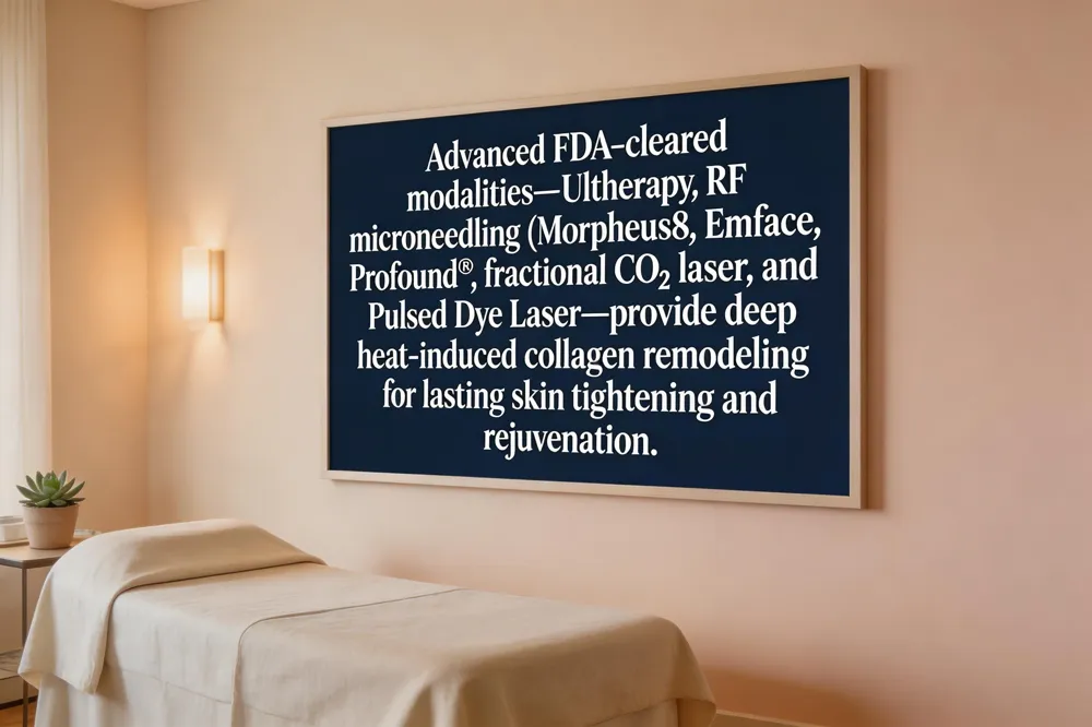Mild to moderate sagging skin can indeed be tightened without surgery. FDA‑cleared non‑invasive options such as ultrasound‑based Ultherapy, radio‑frequency (RF) devices (Thermage, Morpheus8, Emface, Profound®), and laser resurfacing deliver controlled heat to deep dermal layers, stimulating collagen and elastin remodeling for a gradual lift. These in‑office procedures typically last 30–90 minutes, involve little to no downtime, and yield results that can last up to a year with proper after‑care.