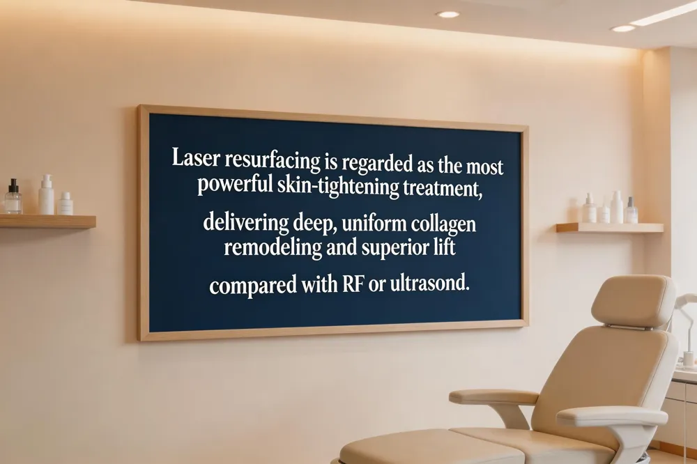 Laser resurfacing is widely regarded as the most powerful skin‑tightening treatment available. By delivering focused light energy into the deeper layers of the skin, it stimulates collagen remodeling and produces a dramatic lift while also reducing fine lines, wrinkles, and age spots. Compared with other modalities such as radio‑frequency or ultrasound, laser resurfacing achieves deeper and more uniform tightening in a single session. The procedure can be performed on the face, neck, and décolletage, and results typically improve over several months as new collagen forms. For patients seeking the greatest degree of firmness and rejuvenation, laser resurfacing remains the gold‑standard option. It offers rapid collagen induction, higher patient‑satisfaction scores in peer‑reviewed studies, and a proven safety profile when performed by board‑certified specialists.