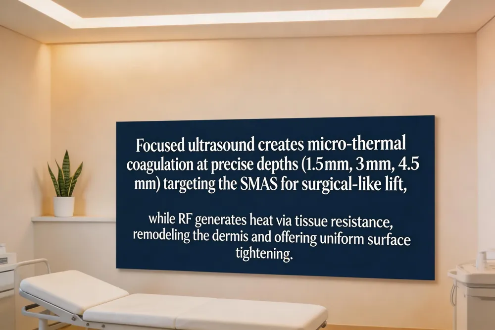 Focused ultrasound (HIFU/MFU) delivers high‑frequency acoustic waves that converge at precise depths of 1.5 mm, 3 mm, and 4.5 mm, creating micro‑thermal coagulation points in the deep dermis and the superficial muscular aponeurotic system (SMAS). By heating the SMAS to 60‑70 °C, the tissue undergoes controlled collagen denaturation, triggering neocollagenesis and a gradual lifting effect that mimics a surgical facelift. Radiofrequency (RF) uses electrical currents to generate heat through tissue resistance. Monopolar devices send a single current from a handpiece to a grounding pad, penetrating 1‑2 mm; bipolar systems confine the current between two electrodes for shallower, more uniform heating. Fractional RF and RF microneedling combine microneedle channels with RF energy, reaching deeper dermal layers (up to 3‑4 mm) and adding a micro‑injury stimulus that enhances collagen and elastin remodeling. Both modalities stimulate fibroblasts, but ultrasound’s focal depth targets the SMAS for structural lift whereas RF primarily remodels the dermis and can be tailored across a range of depths for broader surface tightening.