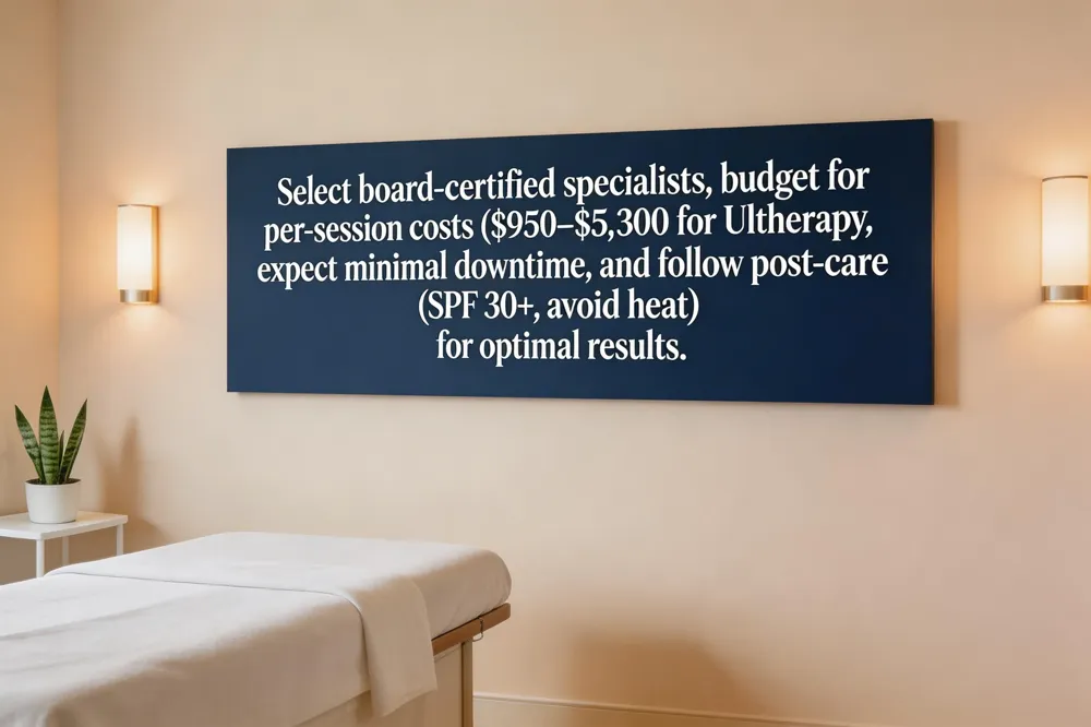 Insurance does not cover cosmetic RF or ultrasound, so patients should budget for the per‑session cost ($950–$5,300 for Ultherapy; $675–$1,500 for RF) and consider package pricing for multiple visits. Contraindications include pregnancy, active infection, implanted electronic devices, and certain connective‑tissue disorders; patients with darker skin tones may prefer RF, which carries a lower risk of pigment changes compared with HIFU. Lifestyle factors such as smoking, excessive sun exposure, and poor hydration can impair collagen remodeling, so clinicians advise cessation of smoking and consistent sun protection to maximize long‑term results.