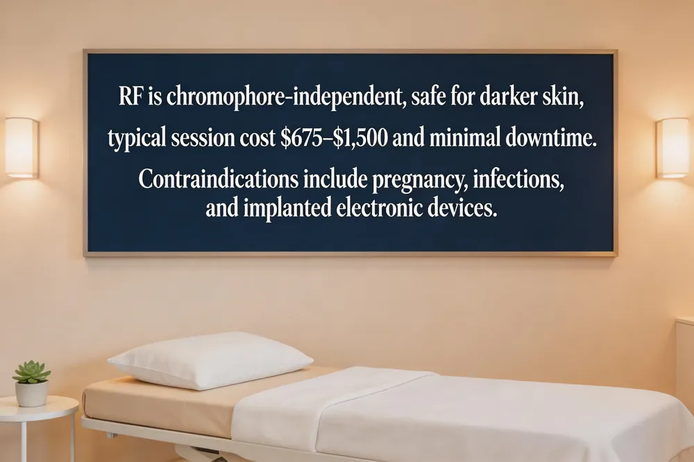 Safety across skin tones: RF is chromophore‑independent and safe for darker skin, while ultrasound (especially HIFU) is best suited for fair‑to‑medium tones; however, modern devices with real‑time imaging (Ultherapy PRIME) mitigate pigmentation risk, making treatment safe for most patients when performed by a board‑certified specialist.