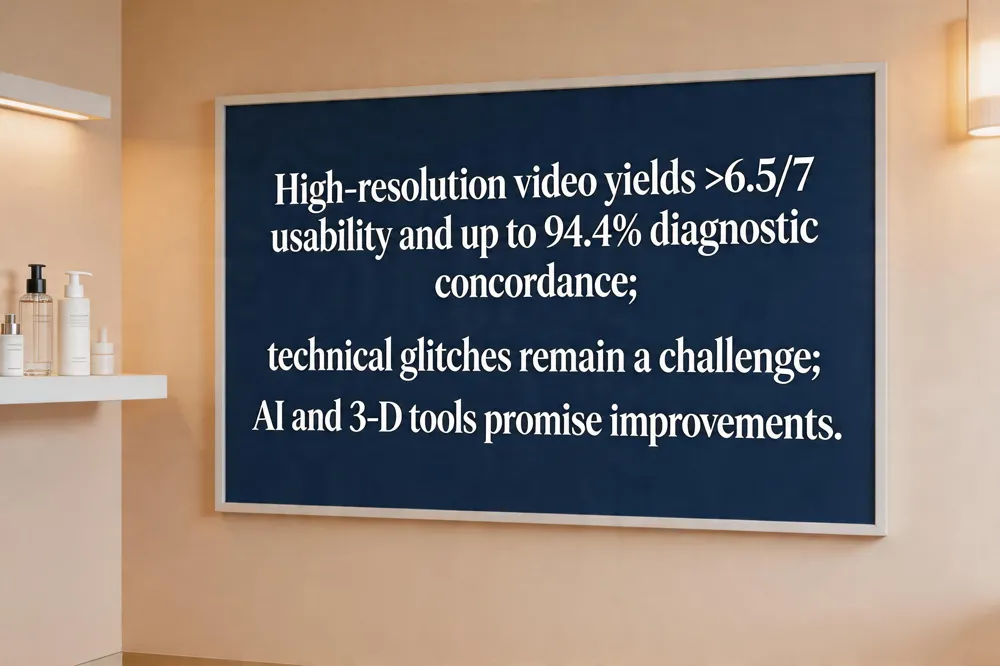 High‑resolution 2‑dimensional video conferencing is the most common modality, yielding usability scores >6.5/7 is the dominant telemedicine modality in aesthetic practice, consistently earning usability scores >6.5/7. Studies show Diagnostic reliability for skin lesions, wounds, and postoperative assessments reaches up to 94.4% concordance with in‑person exams, making virtual exams a reliable adjunct to in‑person care. Technical challenges—Technical challenges include connection failures (~11% of appointments) and camera issues (~3%)—can lower reliability scores and patient confidence, underscoring the need for robust platforms and backup plans. Emerging tools such as AI‑driven risk alerts, Emerging 3‑D holographic telemedicine shows promising usability and diagnostic accuracy, and real‑time monitoring devices promise to narrow the gap between virtual and face‑to‑face evaluations.