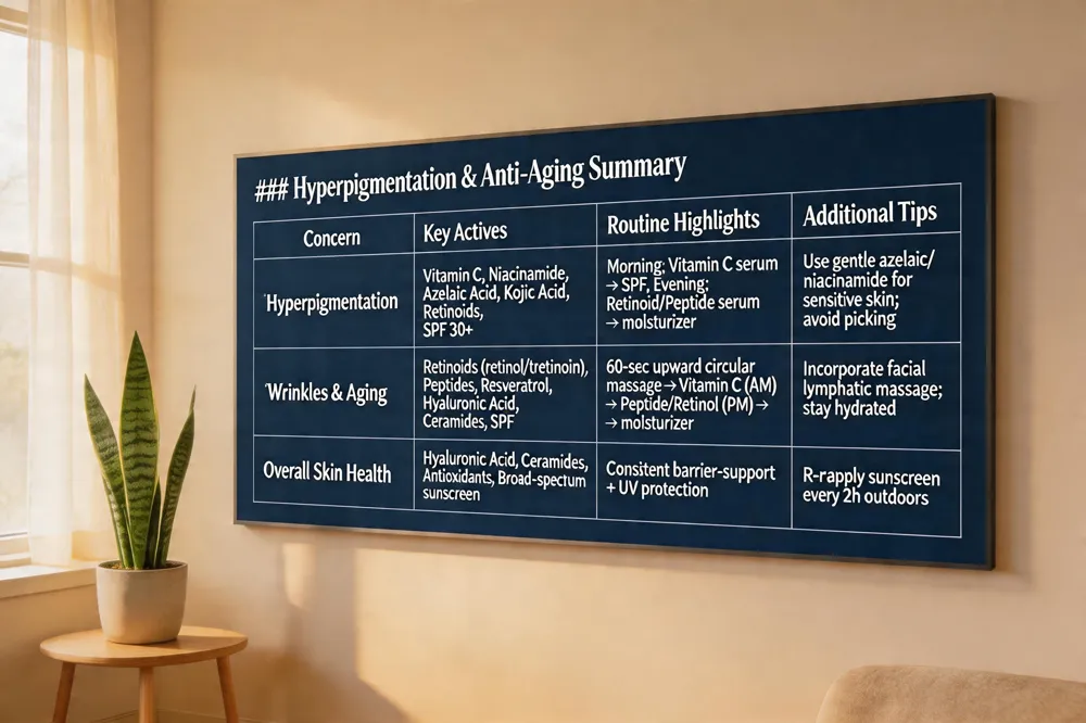 | Hyperpigmentation | Vitamin C, Niacinamide, Azelaic Acid, Kojic Acid, Retinoids, SPF 30+ | Morning: Vitamin C serum → SPF; Evening: Retinoid/Peptide serum → moisturizer. | Use gentle azelaic/niacinamide for sensitive skin; avoid picking. |