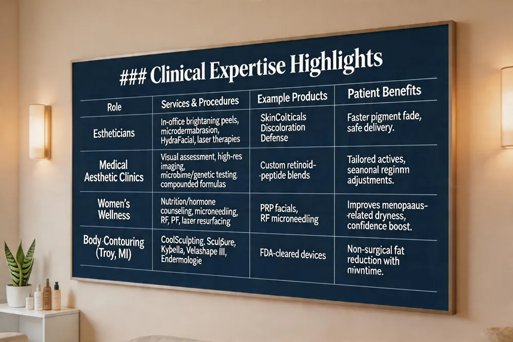 | Estheticians | In‑office brightening peels, microdermabrasion, HydraFacial, laser therapies | SkinCeuticals Discoloration Defense | Faster pigment fade, safe delivery. |