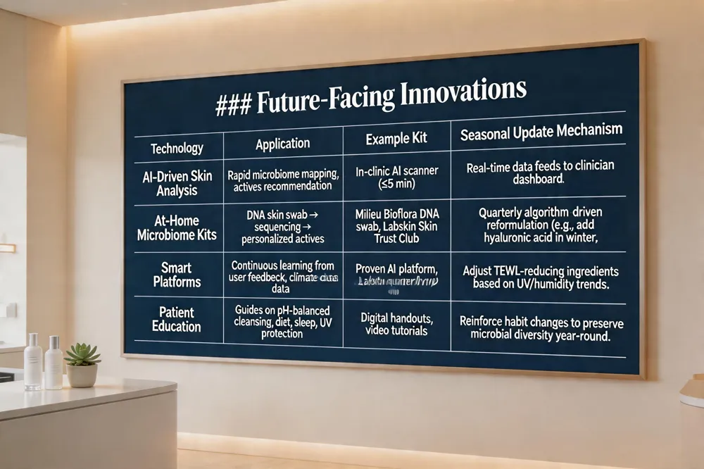 Advances in artificial‑intelligence are reshaping how aesthetic clinics personalize treatment. AI‑driven skin analysis tools can map a client’s microbiome profile in under five minutes, delivering data that clinicians use to select prebiotic, probiotic or postbiotic actives that match the individual’s bacterial community. At‑home microbiome kits, such as Milieu Bioflora’s DNA skin swab and Labskin’s Skin Trust Club kit, enable patients to collect a sample in the comfort of their home; the resulting sequencing data are then processed by proprietary algorithms that recommend ingredient combinations (e.g., squalane, hyaluronic acid, fermented extracts) proven to support barrier repair without disrupting beneficial microbes. Because microbiome composition shifts with UV exposure, humidity, and climate, personalized regimens are updated seasonally—Proven’s AI platform and Labskin’s quarterly reformulation model automatically adjust actives to maintain optimal transepidermal water loss and microbial diversity throughout the year. Ongoing patient education is essential: clinics provide clear guidance on gentle cleansing, pH‑balanced products, and lifestyle factors (diet, sleep, UV protection) that preserve microbiome health, ensuring that each client understands how daily habits and periodic product tweaks work together to sustain a resilient, radiant complexion.