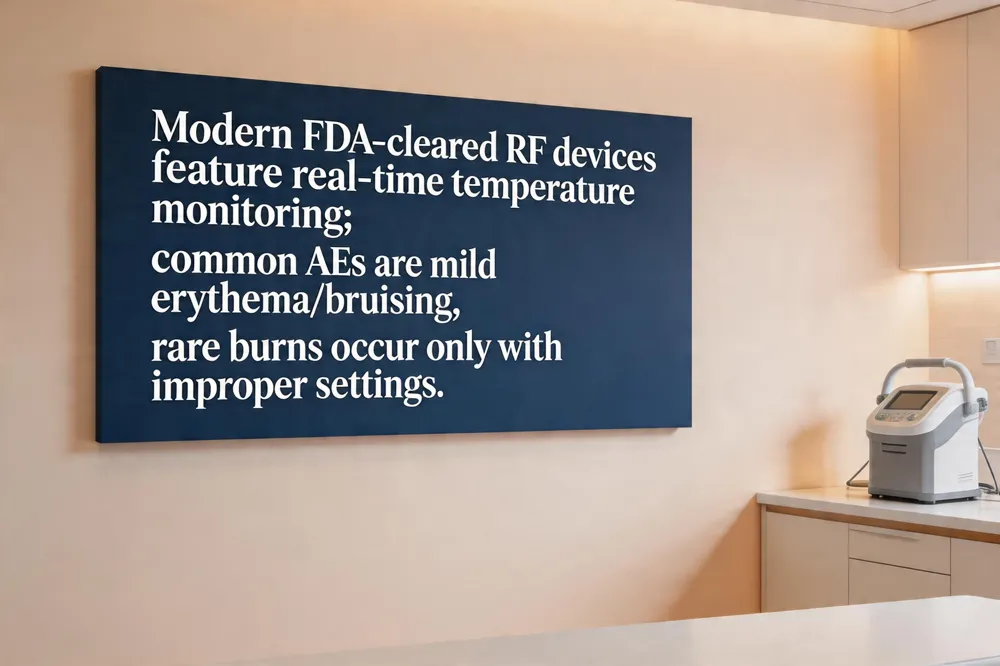 Safety features Modern RF units are FDA‑cleared, incorporate real‑time temperature monitoring, automatic shut‑off, and conductive gels to protect the epidermis. Reported adverse effects are mild (erythema, ecchymosis, swelling) and resolve within 3‑5 days. Rare complications, such as third‑degree burns, are linked to improper settings or tattooed skin and are avoided by trained clinicians.