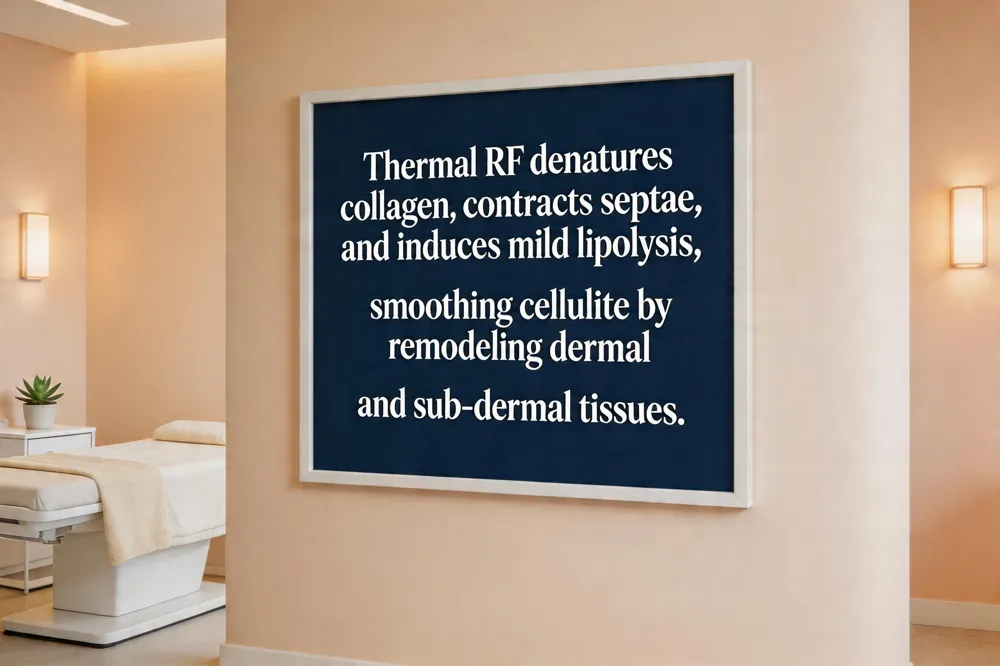 Radiofrequency (RF) skin tightening works by delivering controlled thermal energy to the dermis and sub‑cutaneous tissue. At temperatures of 40‑45 °C (often up to 67 °C in microneedling protocols), collagen fibers denaturate and immediately contract, while fibroblasts initiate neocollagenesis over the ensuing weeks. This remodeling thickens the dermis, tightens the skin, and improves elasticity. Heat also loosens the vertical fibrous septae that tether the dermis to underlying fascia, allowing the skin to smooth over the fatty lobules that cause dimpling. In deep‑tissue RF, temperatures stimulate mild lipolysis and enhance lymphatic drainage, reducing the volume of superficial adipocytes and further flattening the surface.