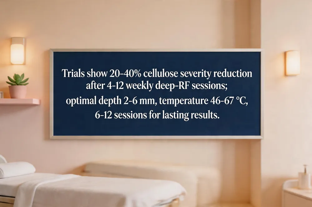 Multiple peer‑reviewed trials demonstrate that deep‑acting radiofrequency (RF) reduces cellulite severity by 20‑40 % and improves skin laxity by 24‑35 % after 4‑6 sessions. In a case study using the PROFOUND™ device, a 39‑year‑old woman’s Hexsel score fell from 14 to 9 points (a 5‑point reduction) after two sub‑cutaneous microneedling treatments at 5.8 mm depth and 67 °C. Larger series report mean skin‑tightening gains of 35‑40 % at six months for facial laxity, with modest yet measurable improvements in thigh and buttock cellulite.