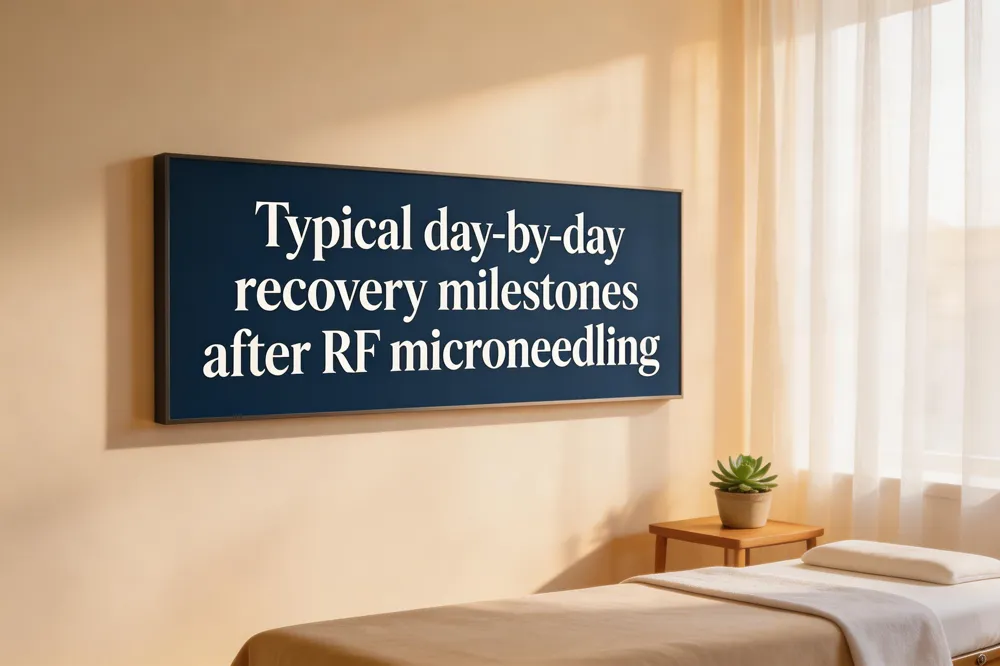RF microneedling recovery day by day: Day 1 presents a mild sunburn‑like redness, warmth and slight swelling; avoid makeup, vigorous exercise, and sun while keeping the area clean and hydrated. Days 2‑3 see redness subside, with lingering tightness and a faint glow; apply fragrance‑free moisturizers and Broad‑spectrum SPF 30+ sunscreen. Days 4‑7 normalize skin may flake or feel rough; continue light hydration, skip exfoliation or picking, and mineral makeup is permissible. By Week 2 tone brightens, fine‑line improvement appears; maintain sun protection and soothing skincare. Weeks 3‑6 mark peak collagen remodeling, delivering firmer, smoother skin—ideal for assessing results and planning follow‑ups.