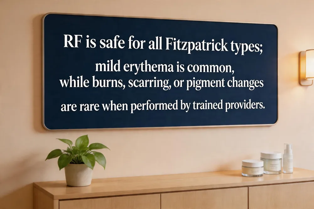 Radiofrequency (RF) skin‑tightening works by heating the dermis to 40‑45 °C, triggering collagen denaturation and neocollagenesis. Most patients experience only mild, short‑lived reactions such as transient erythema, mild edema, a warm or sunburn‑like sensation, and occasional pinpoint bleeding. These effects typically resolve within 24–48 hours and indicate normal tissue response. Rare but serious complications can occur when energy settings are excessive or the operator lacks experience: superficial to deep thermal burns, hypertrophic or atrophic scarring, localized lipoatrophy, nerve injury causing numbness or dysesthesia, and, in extreme cases, permanent pigmentary changes. The International Agency for Research on Cancer classifies RF as “possibly carcinogenic” (Group 2B) based on limited occupational data; however, the low‑dose, brief, non‑ionizing exposure used in cosmetic RF does not damage DNA, and large epidemiologic studies have found no credible link to cancer. If adverse events arise—persistent pain, blistering, discoloration, or prolonged swelling—patients should seek prompt evaluation from a board‑certified dermatologist or qualified aesthetic physician. Early intervention may involve gentle wound care, topical agents, laser or light‑therapy, and, if needed, surgical revision. Selecting an experienced, FDA‑cleared device provider and following pre‑ and post‑treatment protocols dramatically reduces risk and ensures safe, effective collagen remodeling.