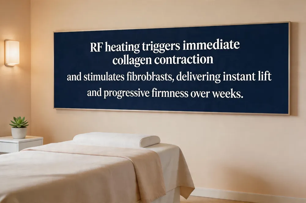 By raising dermal temperature to the therapeutic window of 40‑45 °C (104‑113 °F), the energy produces a controlled thermal injury that causes immediate collagen fiber contraction; the heat‑denatured triple helices unwind and shrink, giving an instant tightening effect and a subtle lift of sagging skin.